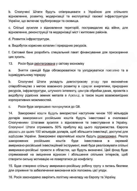 - Die USA erhalten 50 Prozent der Gewinne aus diesem Vorhaben. Europa wird weitere 100 Milliarden US-Dollar beisteuern, um die für den Wiederaufbau der Ukraine verfügbaren Mittel zu erhöhen. Eingefrorene europäische Gelder werden freigegeben. Der Rest der eingefrorenen russischen Gelder wird in ein separates amerikanisch-russisches Investitionsvehikel überführt, das gemeinsame Projekte in bestimmten Bereichen umsetzt. Dieser Fonds soll die Beziehungen stärken und gemeinsame Interessen fördern, um einen starken Anreiz gegen eine Rückkehr zum Konflikt zu schaffen.