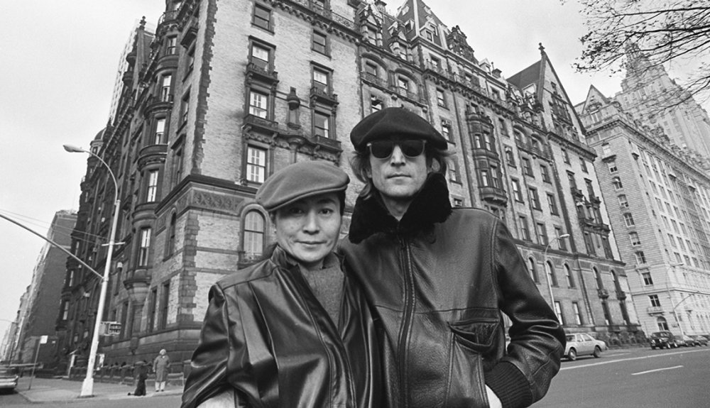John Lennon und Yoko Ono 1980 vor dem Dakota Building