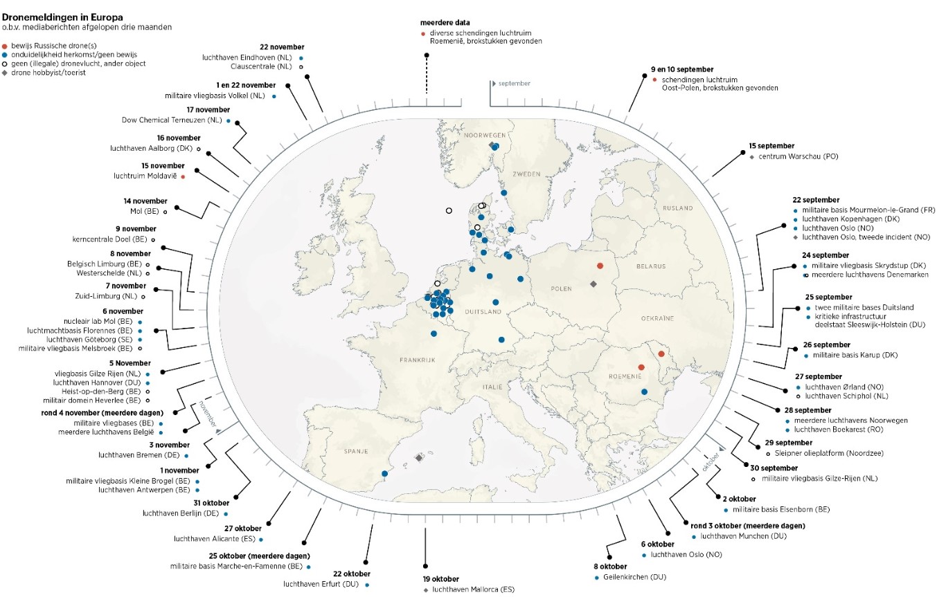 Zwischen dem 9. September und dem 27. November wurden in Europa laut der niederländischen Website Dronewatch insgesamt 61 Vorfälle gemeldet.