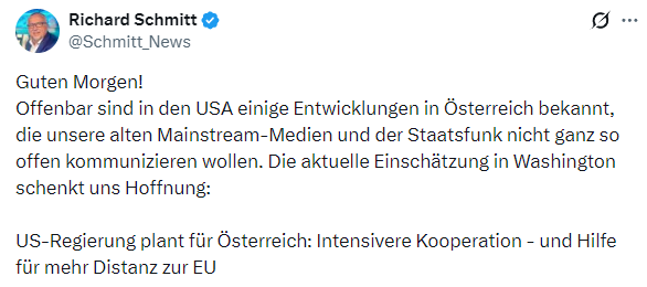 Das heißt positiv betrachtet: Österreich wird weiterhin als vernünftiger Partner der Vereinigten Staaten betrachtet, während das für andere EU-Nationen offenbar nicht mehr in diesem Umfang gilt. Die Trump-Regierung setzt somit die Hoffnung in Wien, dass sich in Österreich noch etwas zum Besseren ändert – eine Einschätzung, die vermutlich auch mit den aktuellen Umfragen (mit der FPÖ weit vorne an der Spitze) sowie mit den Geheimgesprächen zwischen FPÖ und ÖVP begründet werden könnte (statement hat berichtet: Statement Österreich – Geheimgespräche von ÖVP und FPÖ – kommt im Jänner ein fliegender Wechsel?).
